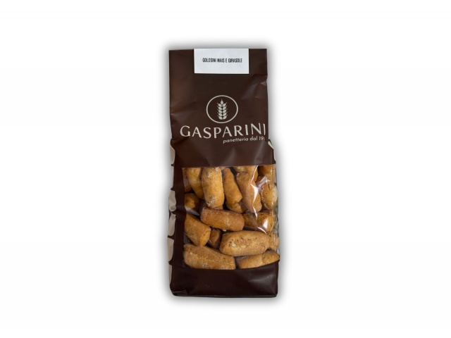 I Golosini Mais e Girasole sono dei croccanti mini grissini all’olio extra vergine d’oliva realizzati con farina di mais e arricchiti da semi di girasole. Semplici, ma ricchi di gusto sono uno snack salato naturale da gustare come spezza fame durante la giornata, per originali aperitivi o come sostituto del pane.